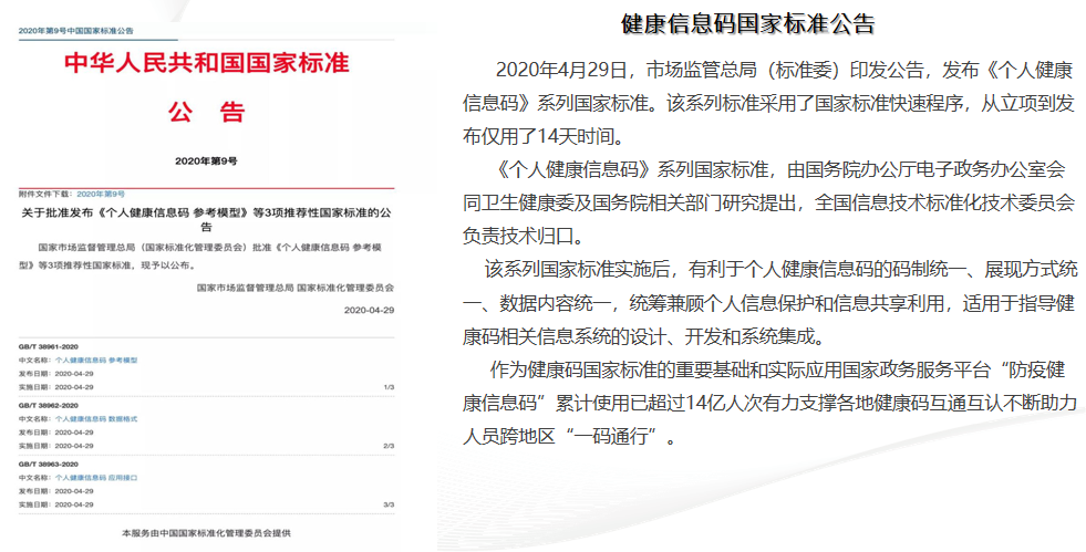 2020年4月29日,市場(chǎng)監(jiān)管總局(標(biāo)準(zhǔn)委)印發(fā)公告,發(fā)布《個(gè)人健康信息碼》系列國(guó)家標(biāo)準(zhǔn)。該系列標(biāo)準(zhǔn)采用了國(guó)家標(biāo)準(zhǔn)快速程序,從立項(xiàng)到發(fā)布僅用了14天時(shí)間。
