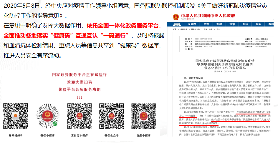 在意見(jiàn)中明確了發(fā)揮大數(shù)據(jù)作用,依托全國(guó)一體化政務(wù)服務(wù)平臺(tái),全面推動(dòng)各地落實(shí)“健康碼”互通互認(rèn)“一碼通行”,及時(shí)將核酸和血清抗體檢測(cè)結(jié)果、重點(diǎn)人員等信息共享到“健康碼”數(shù)據(jù)庫(kù),推進(jìn)人員安全有序流動(dòng)。